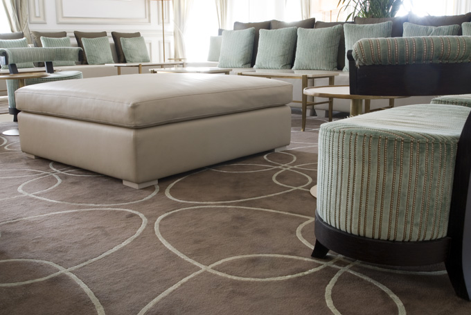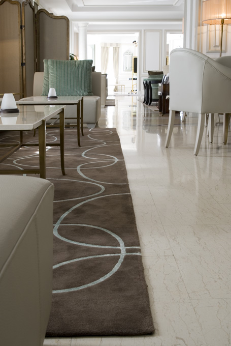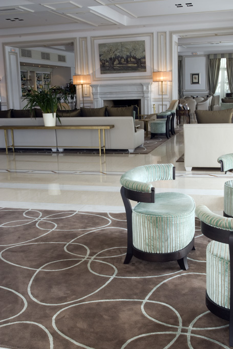 custom wool and silk hand tufted rugs were architect George Merlos’ recent choice for refurbished Thermai Sylla hotel spa’s lobby in Aedipsos – besides being extremely tasteful these patterned rugs were beautifully tailored by casalis in an haute couture fashion